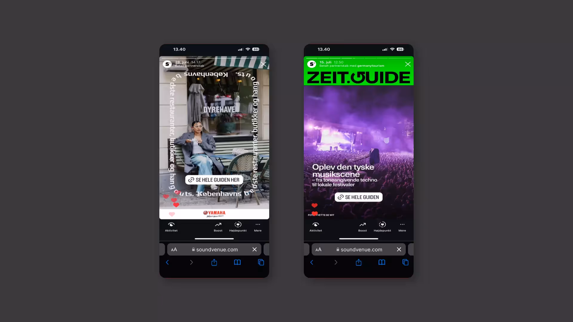 Instagram Stories are shared on Soundvenue’s Instagram, and typically exhibit a high CTR or level of engagement.